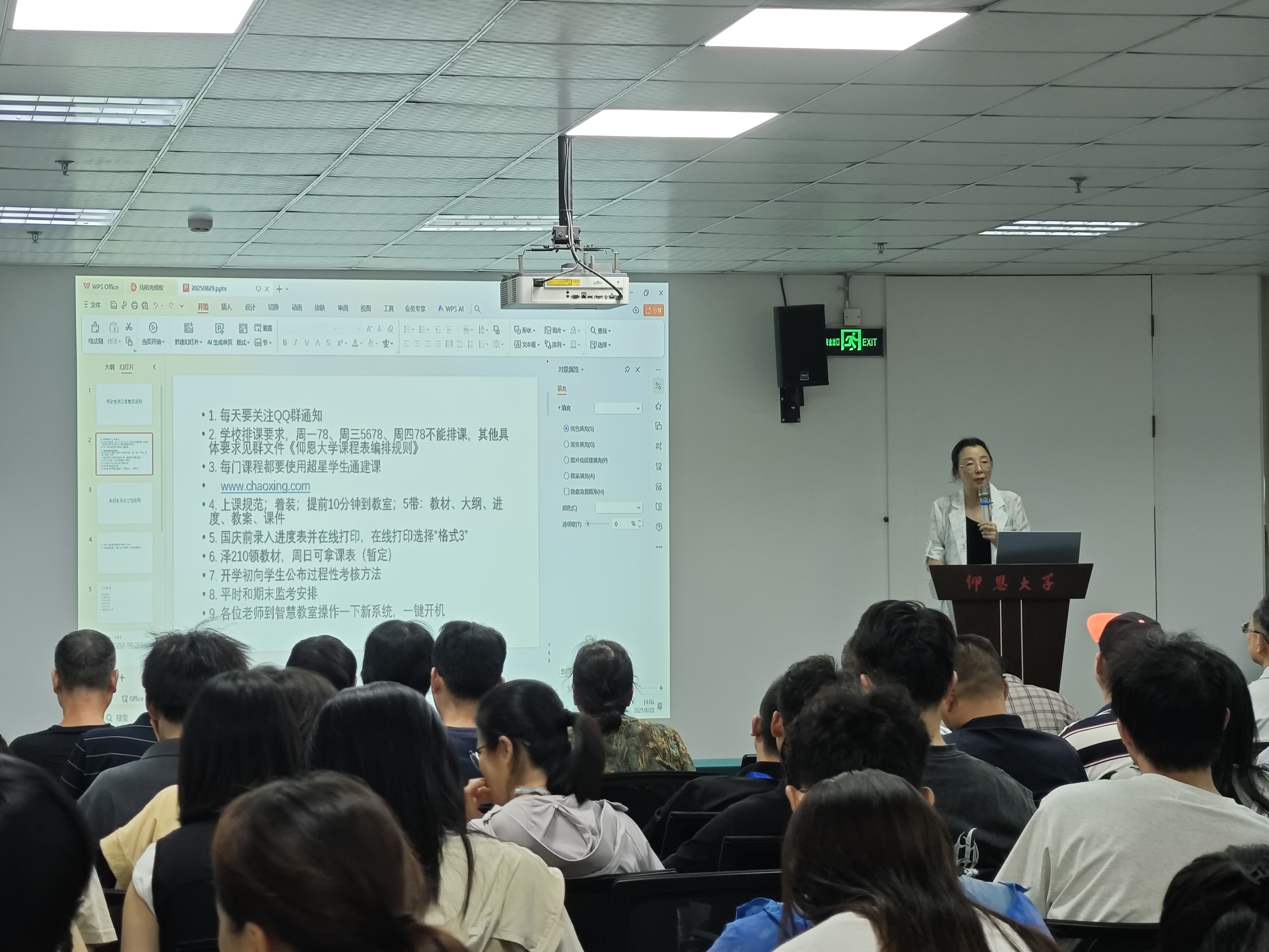 本次会议特别介绍了新投入使用的智慧教室及新版教务系统的功能与操作流程。智慧教室配备互动黑板、多屏协作、智能录播等设备,支持线上线下混合式教学;新教务系统优化了选课、排课、成绩录入及查询等功能,为教师提供更便捷的教学管理服务。