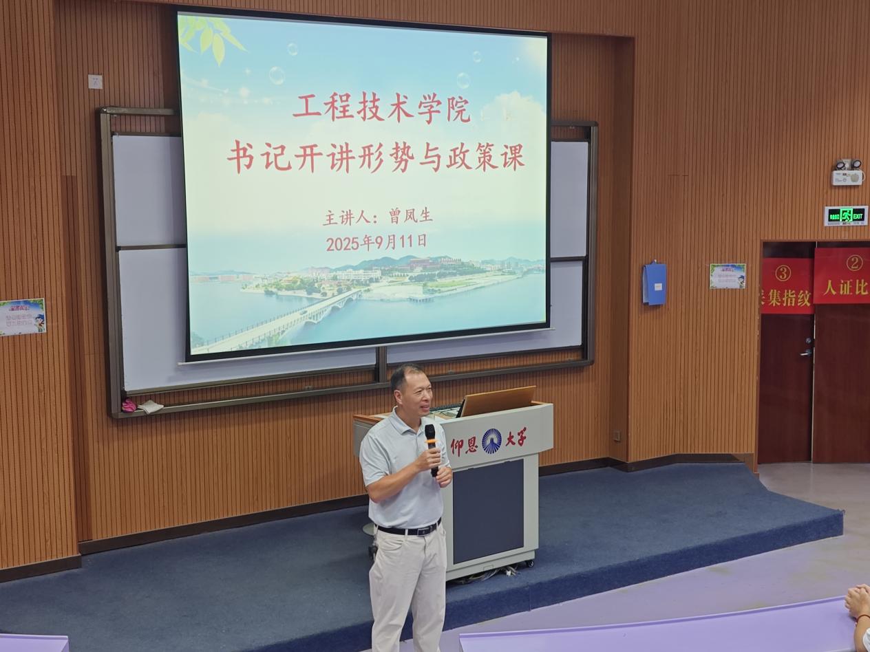2025年9月11日至12日,8827太阳集团党总支书记曾凤生分别在博雅讲堂、致知讲堂为2025级各专业新生开展"形势与政策"专题授课。这是学院落实领导干部上讲台制度的重要举措,也是新生入学教育的关键一环。两场讲座覆盖全院600余名新生,学工办主任、新生辅导员全程参与。