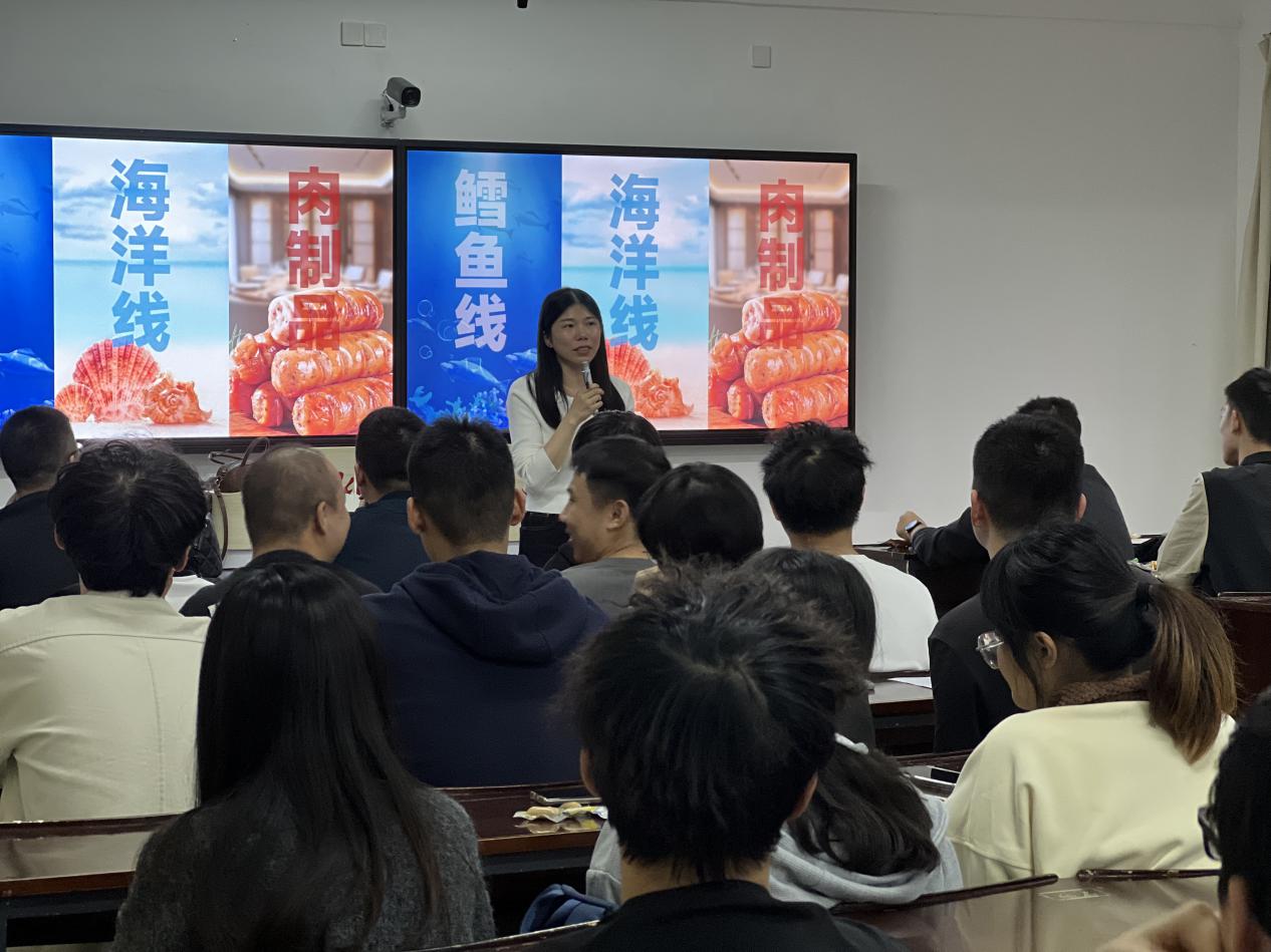 宣讲会伊始,力诚食品的工作人员结合图文资料,详细介绍了企业概况。该公司自 2006 年成立以来,专注于肉制品和海洋类产品的研发、生产与销售,目前拥有六家现代化工厂,建筑面积近 44 万平方米,跻身泉州食品行业前三甲,其力诚鳕鱼肠更是全国销量第一。这些亮眼成绩,让在场学子对企业实力有了直观认知。