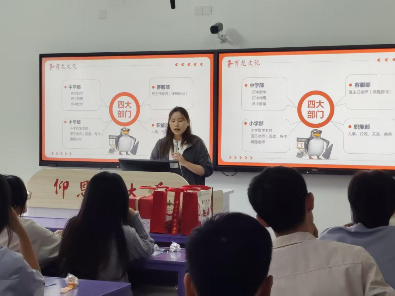 随后,詹璐洁经理结合视频内容,系统介绍了育龙学校的发展概况,针对学生重点关注的岗位需求,详细解读了教学教研、课程顾问、校区管理等核心岗位的职责要求、晋升路径及薪资福利体系,并特别说明学校为新人定制的岗前培训与在职成长计划。